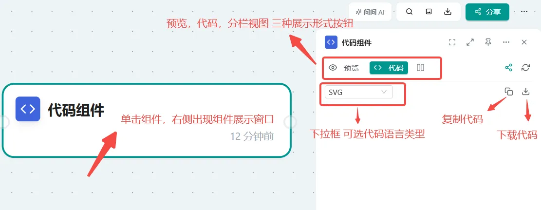 概念: 代码组件允许您将代码内容嵌入到画布中,并提供以下三种视图模式,以便更好地展示和编辑代码:
