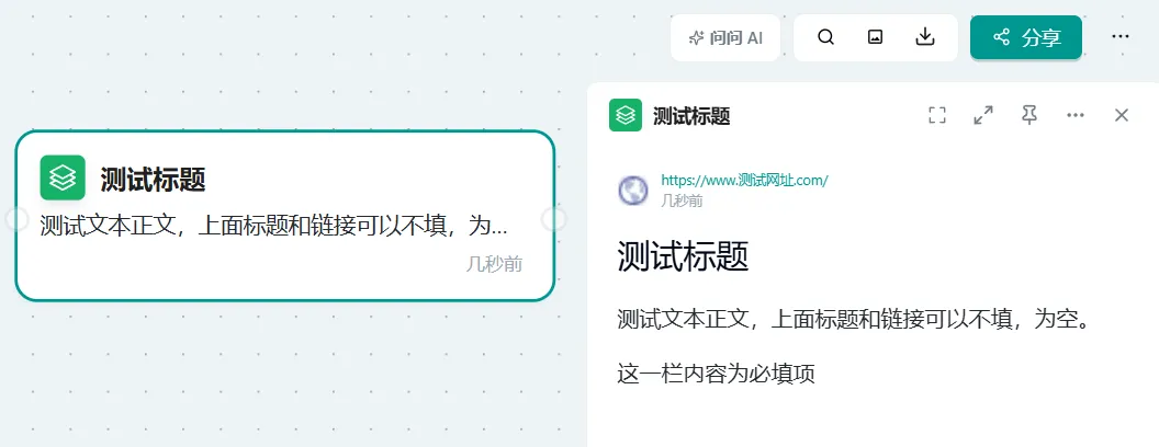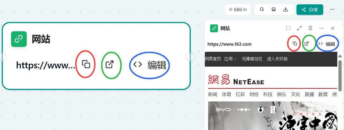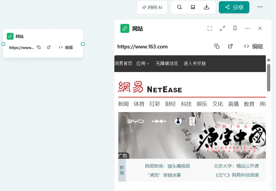 概念: 网站节点功能允许您将网页内容导入到画布中,并将其转化为可交互的节点。您可以基于这些节点内容直接向 AI 提问,从而实现对网络资源的智能化利用和分析。