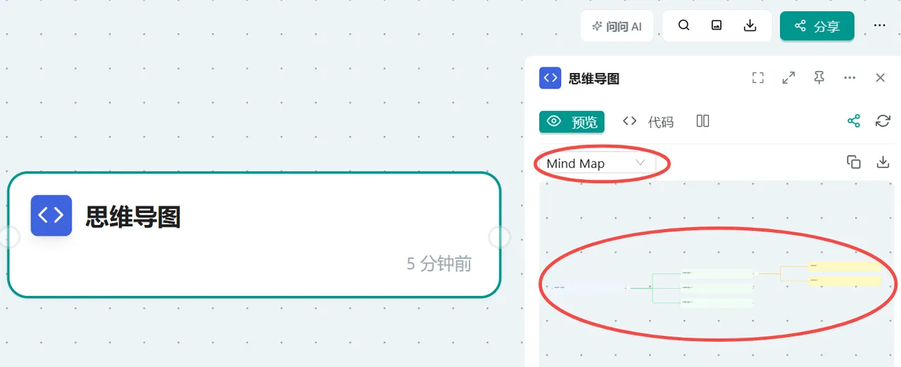 图:新建思维导图节点按钮查看节点预览: 点击思维导图节点,右侧会显示预览效果。您可以看到这是一个 Mind Map 代码小组件,其中包含了您的思维导图内容。