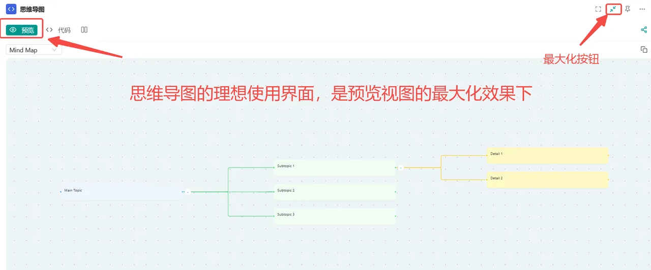 图:通过点击右下角大小控制按钮,调整思维导图的尺寸最大化预览视图: 为了获得更好的使用体验,建议在预览视图下先点击预览按钮,然后点击最大化按钮,进入思维导图的理想使用界面。