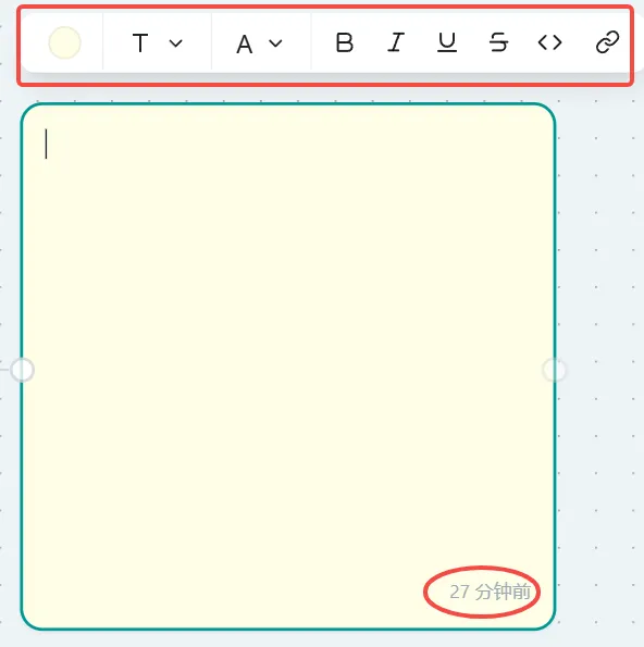 图:点击创建备忘录按钮,默认生成一个浅黄色节点编辑备忘录内容: 点击备忘录节点内部,即可编辑内容。同时,上方会出现编辑工具悬浮窗,您可以修改备忘录的颜色,以及调整内容的字号、颜色等格式。备忘录右下角会显示创建至今的时间。