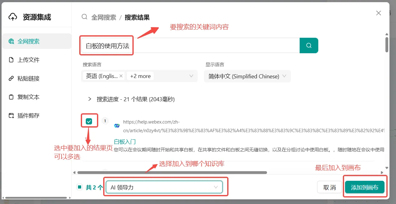 - 概念: 全网搜索功能允许您将互联网搜索结果直接导入到画布中,方便进行内容整合与分析。