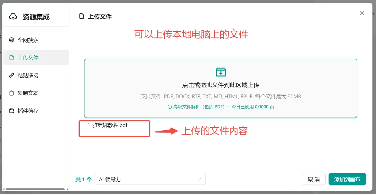 - 概念: 文件上传功能允许您将本地文件导入到画布中,以便进行内容的便捷管理与处理。