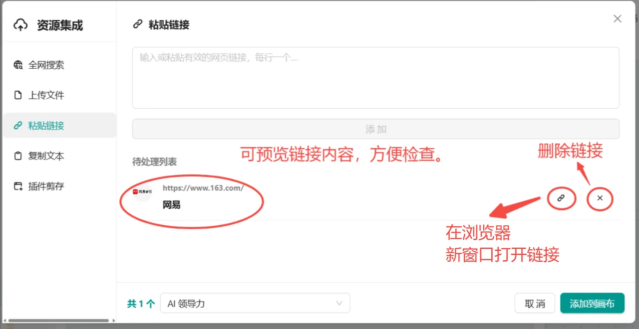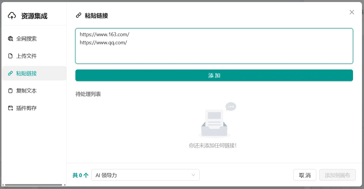 - 操作: 您可以将选好的链接粘贴到输入框中,将其添加到画布里。