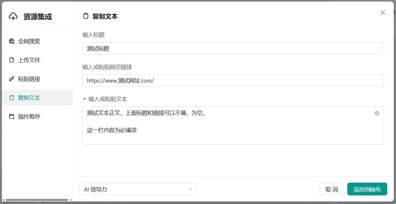 - 概念: 复制文本功能允许您输入或粘贴文本内容。标题和链接是可选的,但文本内容是必填项。此功能可以提高效率,减少错误,节省时间,方便从其他来源快速迁移内容。