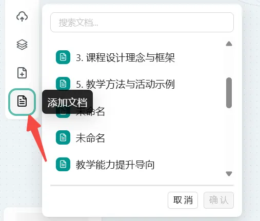 - 概念: “添加文档”功能允许您导入在任意画布中已创建的文档,从而实现文档的跨画布复用。(关于新建文档的方法,请参阅前述“新建文档”功能说明。)